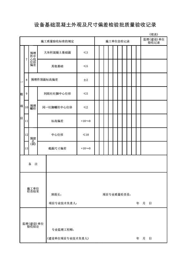 表格名称:设备基础混凝土外观及尺寸偏差检验批质量验收记录
