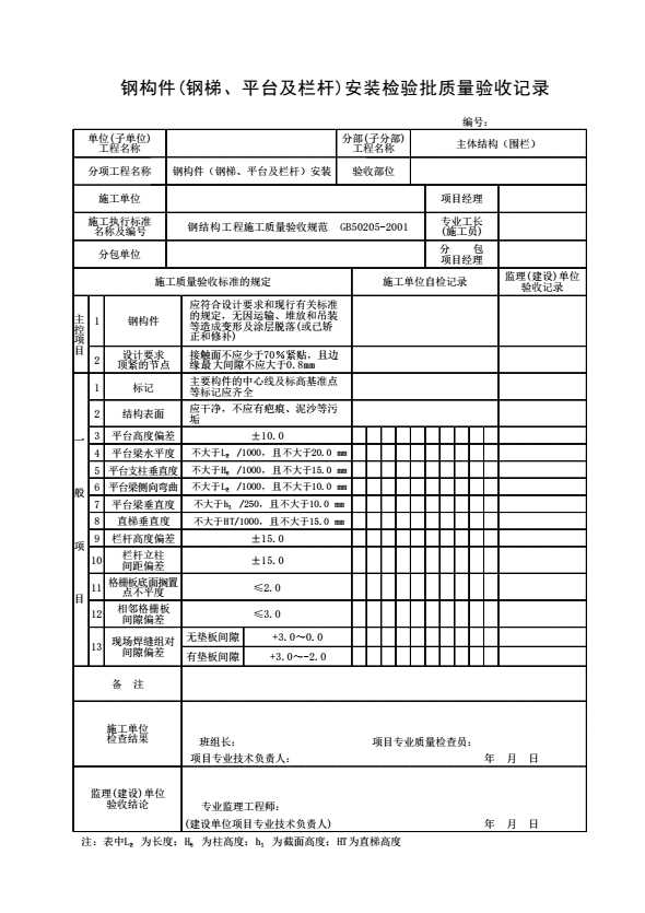 表格名称:钢构件(钢梯、平台及栏杆)安装检验批质量验收记录