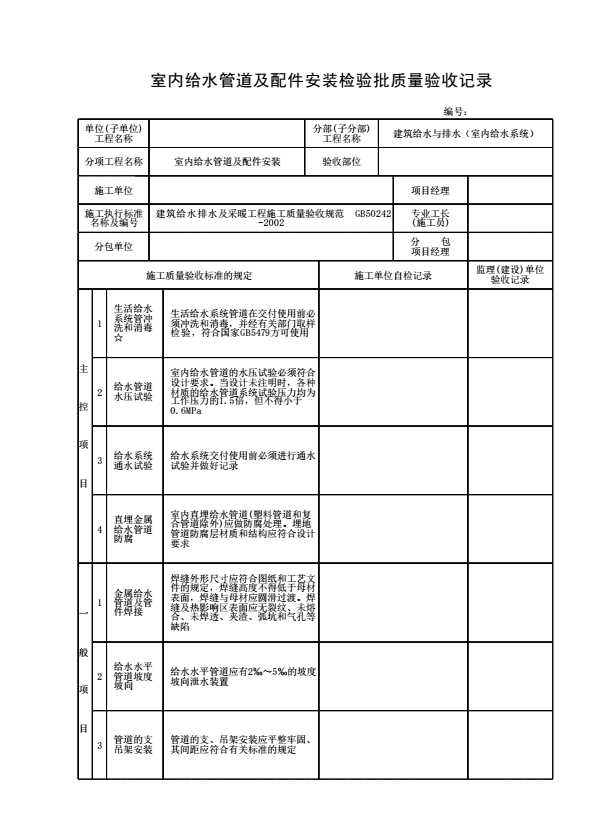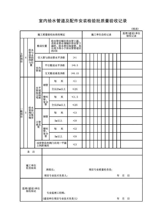 表格名称:室内给水管道及配件安装检验批质量验收记录