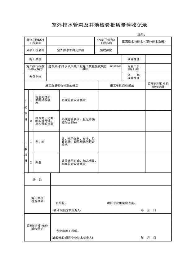 表格名称:室外排水管沟及井池检验批质量验收记录