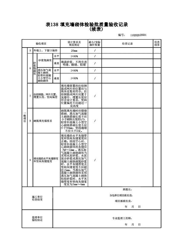 表格名称:110202020501 填充墙砌体检验批质量验收记录