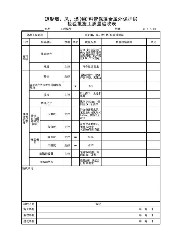 表格名称:表4.4.10 矩形烟、风、燃(物)料管道保温金属外保护层检验批施工质量验收表