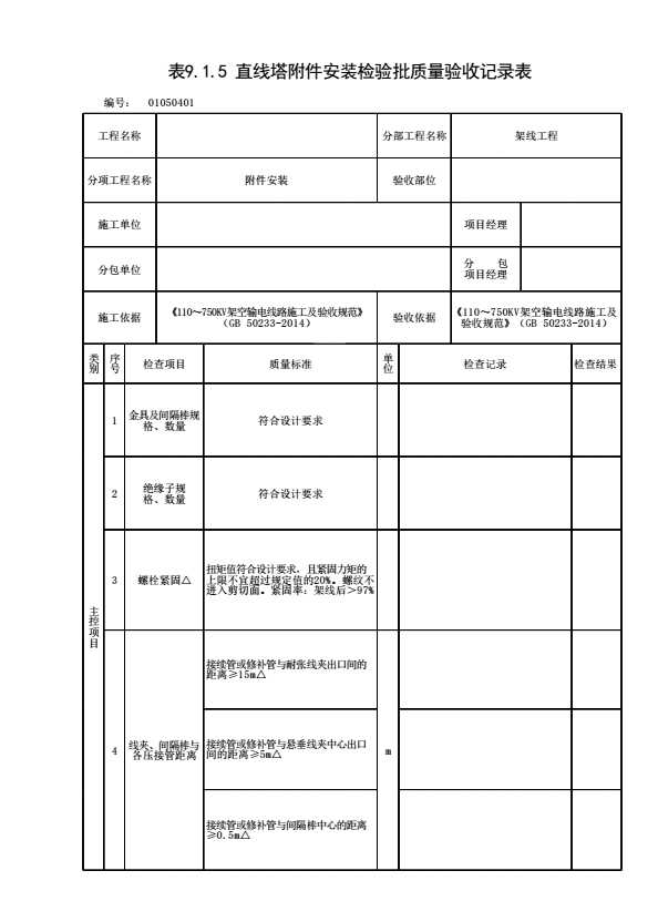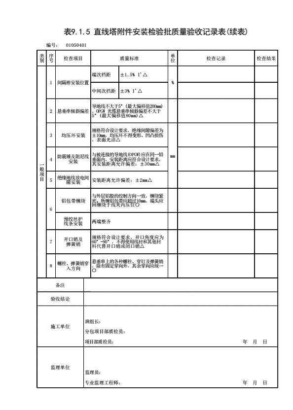 表格名称:表9.1.5 直线塔附件安装检验批质量验收记录表