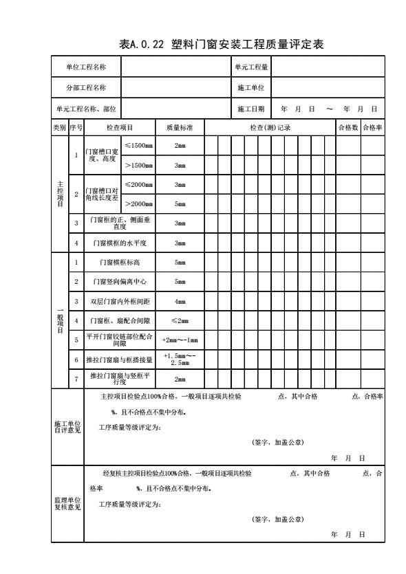 表格名称:表A.0.22 塑料门窗安装工程质量评定表