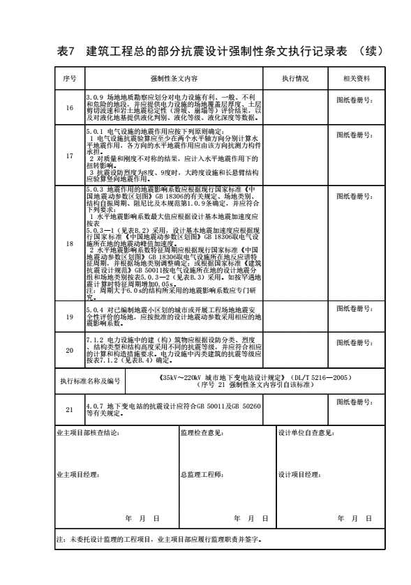 表格名称:表7 建筑工程总的部分抗震设计强制性条文执行记录表