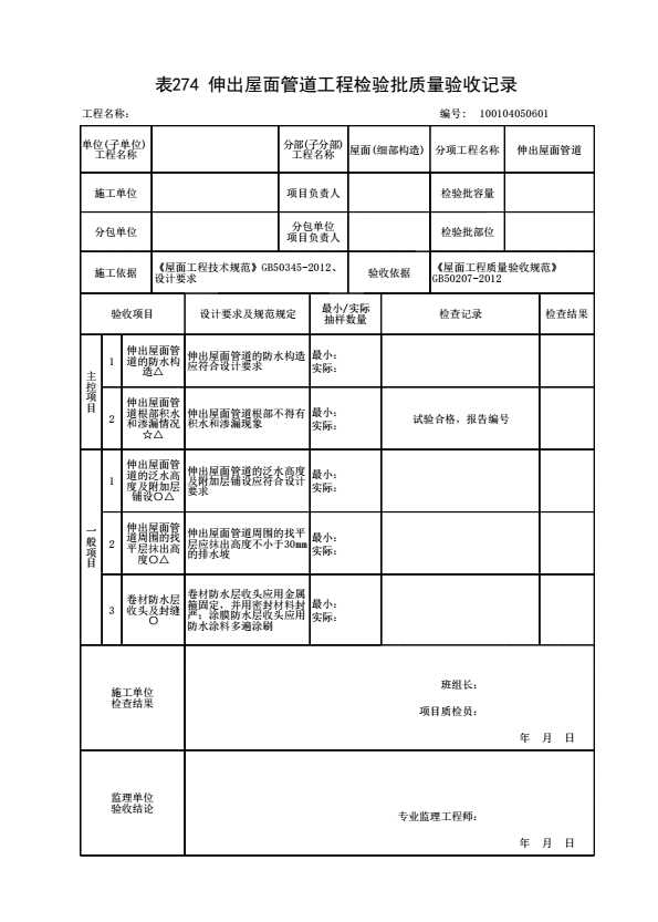 表格名称:100104050601 伸出屋面管道工程检验批质量验收记录