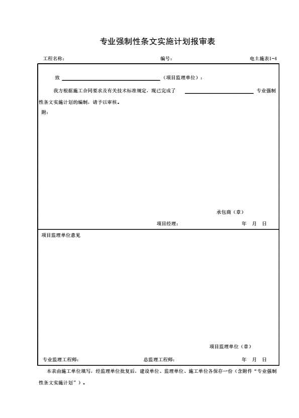 表格名称:电土施表1-4 专业强制性条文实施计划报审表