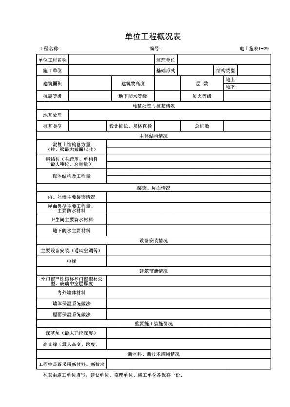 表格名称:电土施表1-29 单位工程概况表