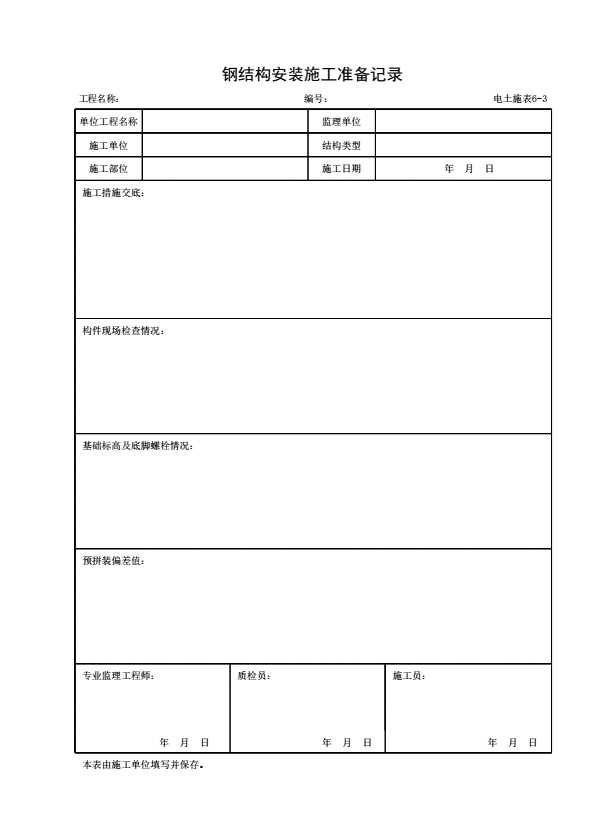 表格名称:电土施表6-3 钢结构安装施工准备记录