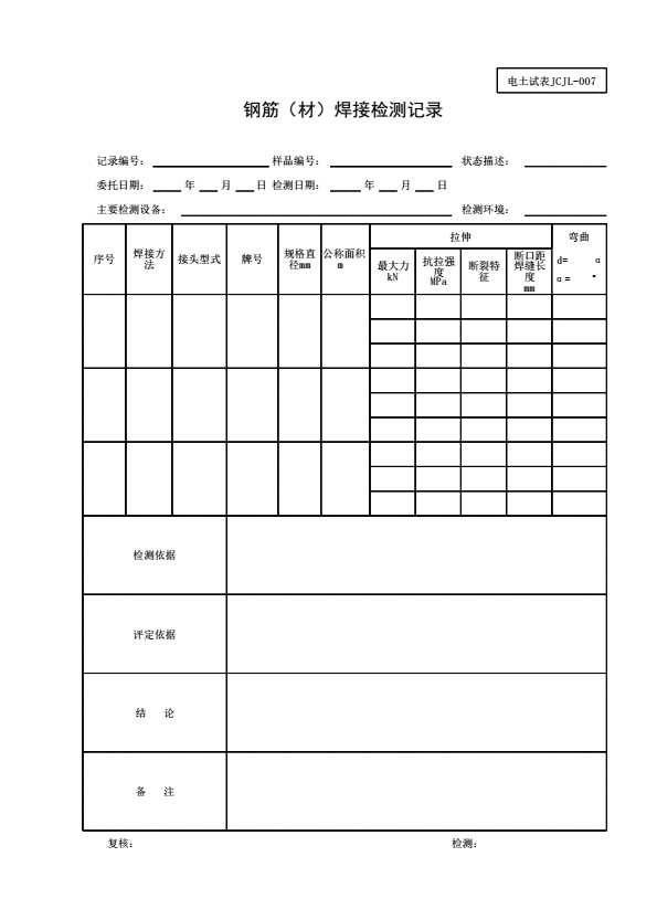 电土试表JCJL-007 钢筋(材)焊接检测记录