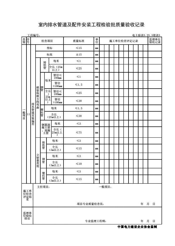 表格名称:电土验表5.25.3 室内排水管道及配件安装工程检验批质量验收记录