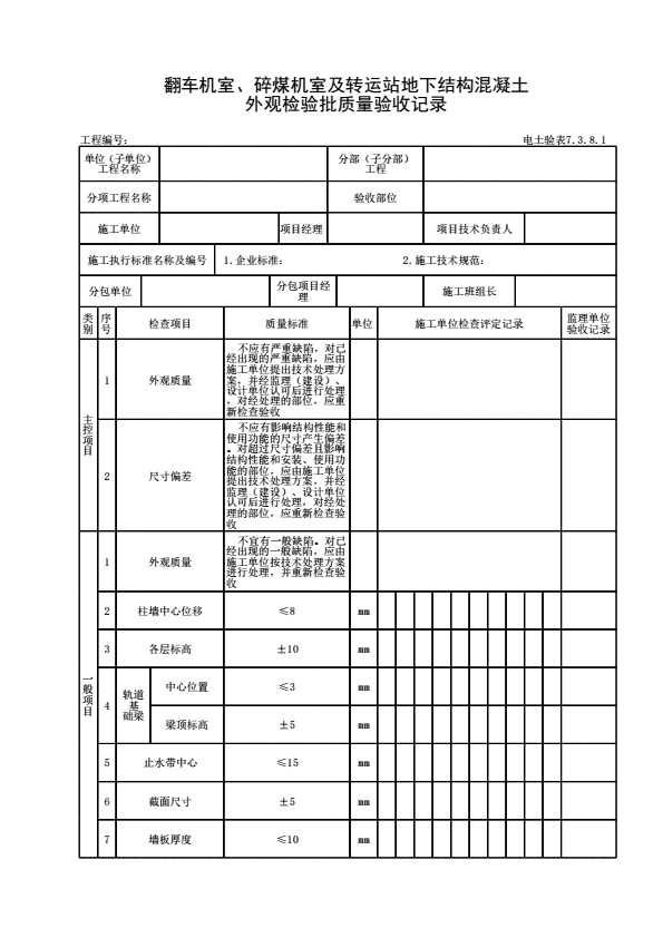 表格名称:电土验表7.3.8.1 翻车机室、碎煤机室及转运站地下结构混凝土外观检验批质量验收记录