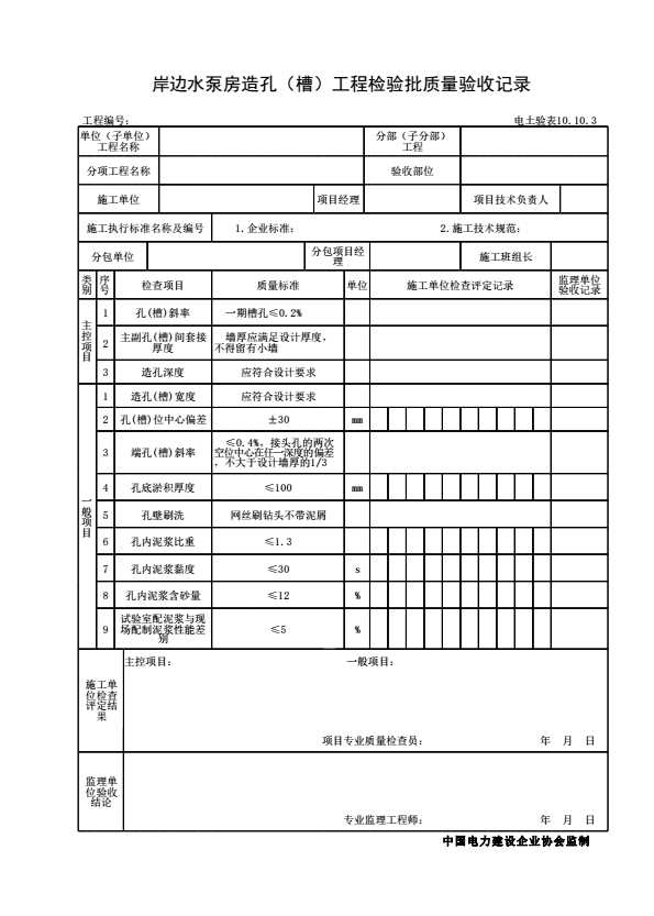 表格名称:电土验表10.10.3 岸边水泵房造孔(槽)工程检验批质量验收记录