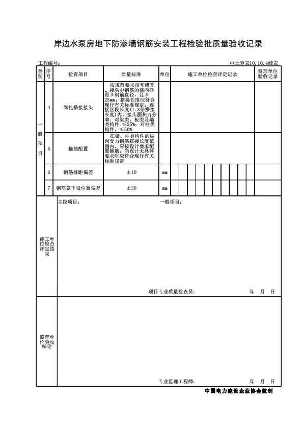 表格名称:电土验表10.10.4 岸边水泵房地下防渗墙钢筋安装工程检验批质量验收记录