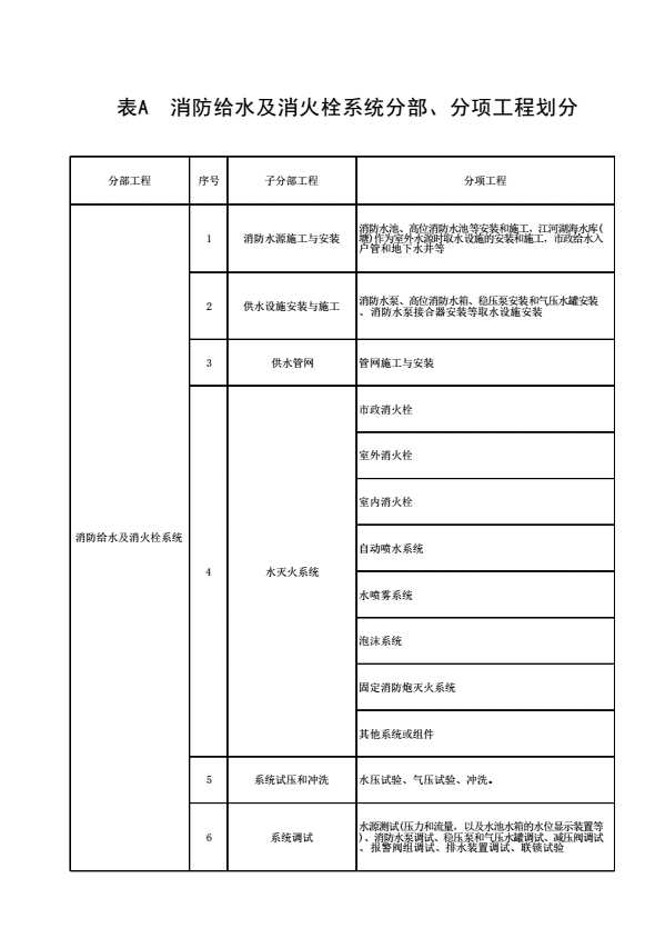 表格名称:表A 消防给水及消火栓系统分部、分项工程划分