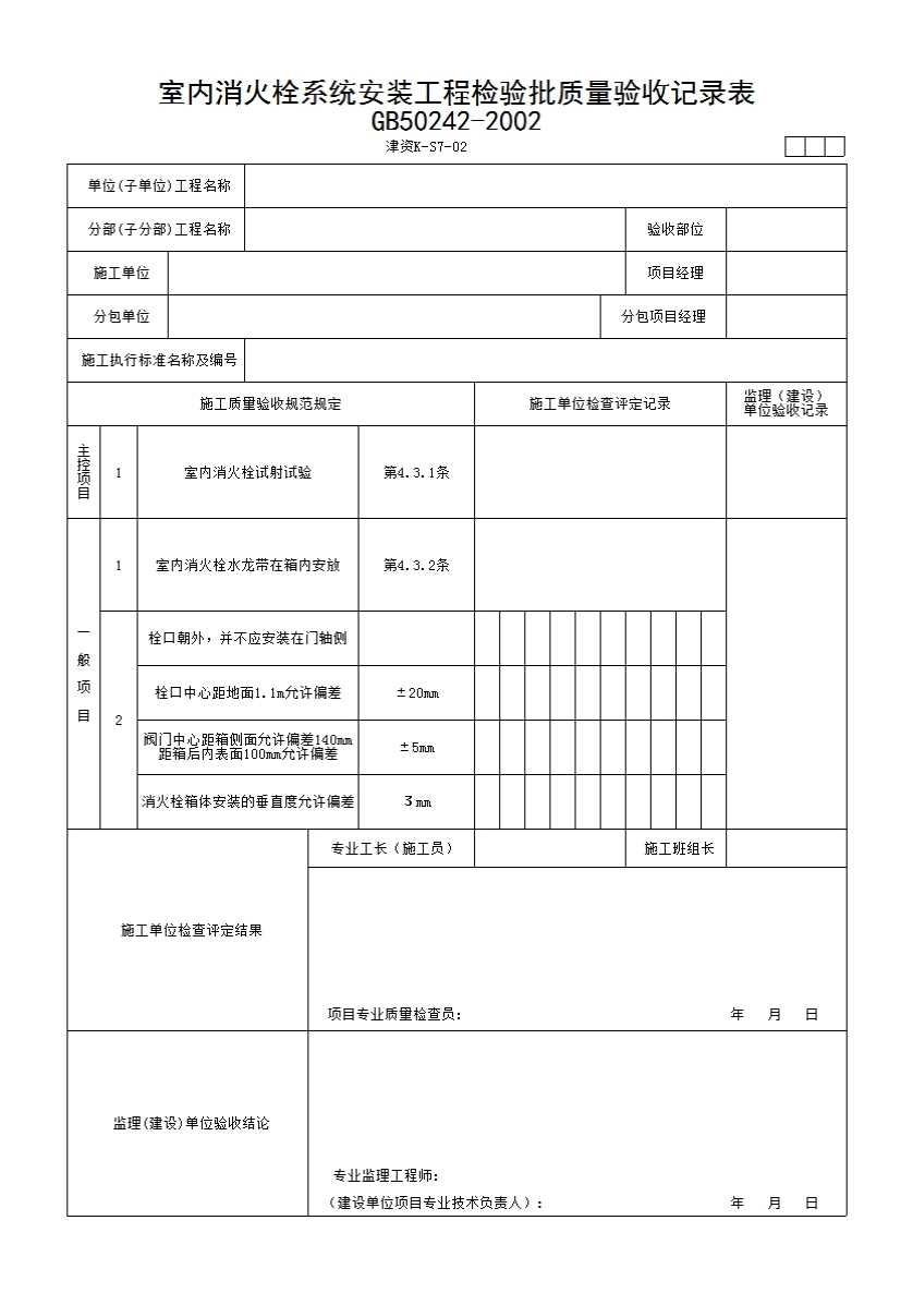 表格名称:津资K-S7-02 室内消火栓系统安装工程检验批质量验收记录表