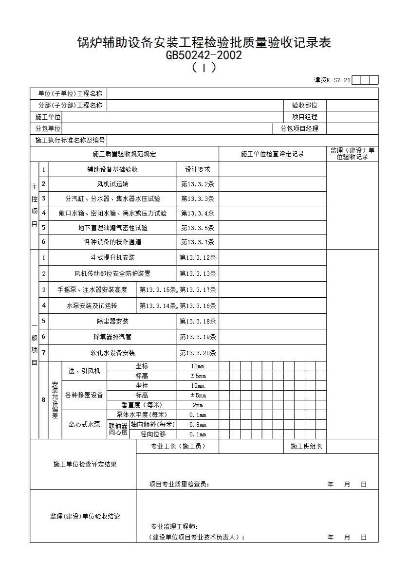 表格名称:津资K-S7-21 锅炉辅助设备安装工程检验批质量验收记录表