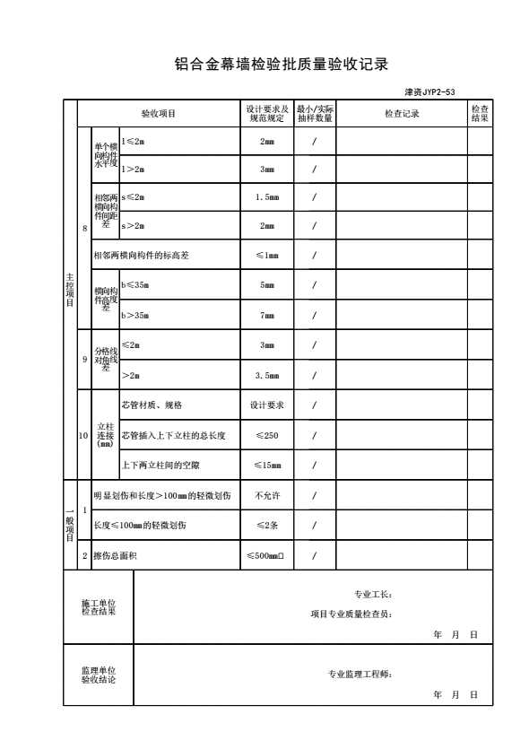 表格名称:津资JYP2-53 铝合金幕墙结构总拼和安装检验批质量验收记录