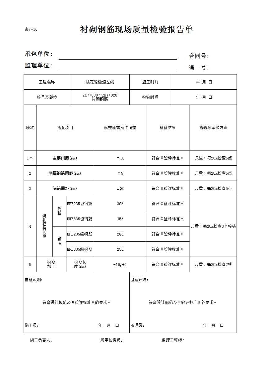 表格名称:表7-16 衬砌钢筋现场质量检验报告单