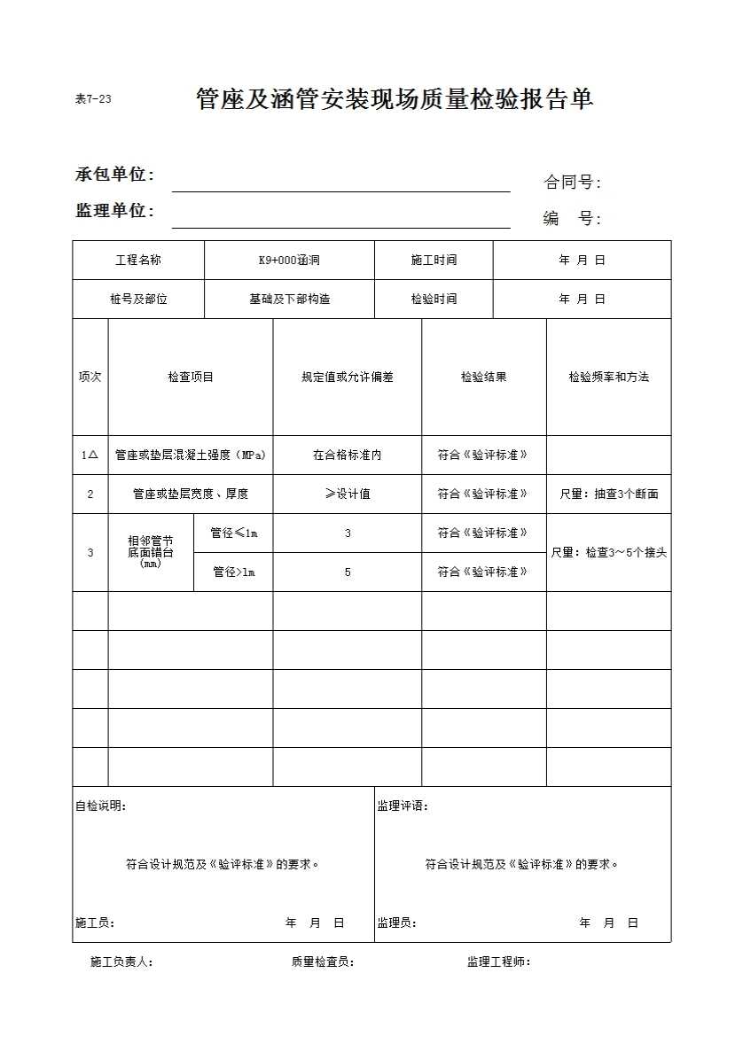 表格名称:表7-23 管座及涵管安装现场质量检验报告单