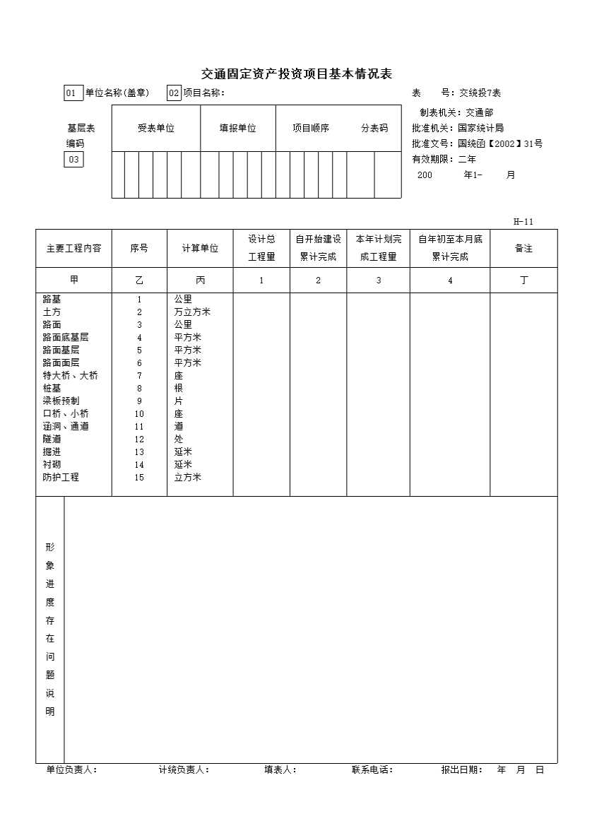 表格名称:H-11 交通固定资产投资项目基本情况表