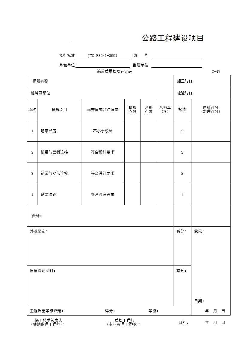 表格名称:C-47表 筋带质量检验评定表