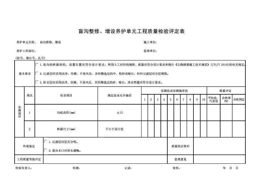 表格名称:盲沟整修、增设养护单元工程质量检验评定表