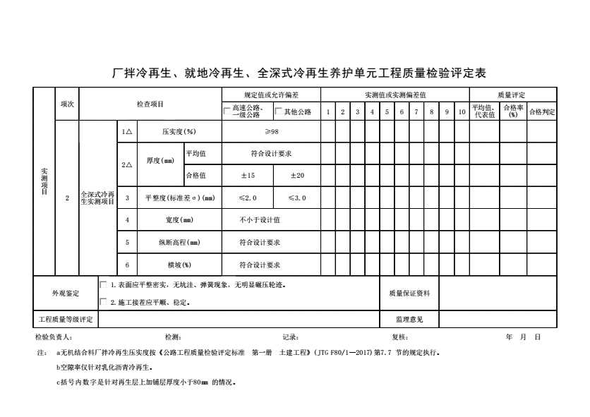 厂拌冷再生、就地冷再生、全深式冷再生养护单元工程质量检验评定表