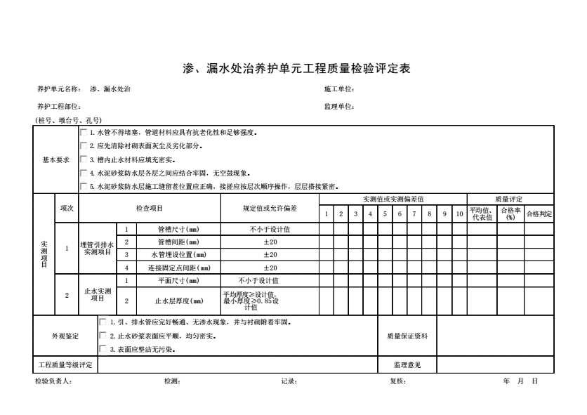 表格名称:渗、漏水处治养护单元工程质量检验评定表
