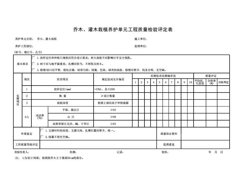 表格名称:乔木、灌木栽植养护单元工程质量检验评定表