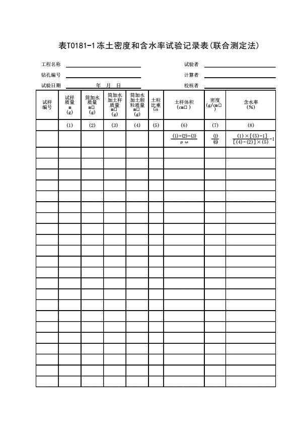 表T0181-1 冻土密度和含水率试验记录表(联合测定法)