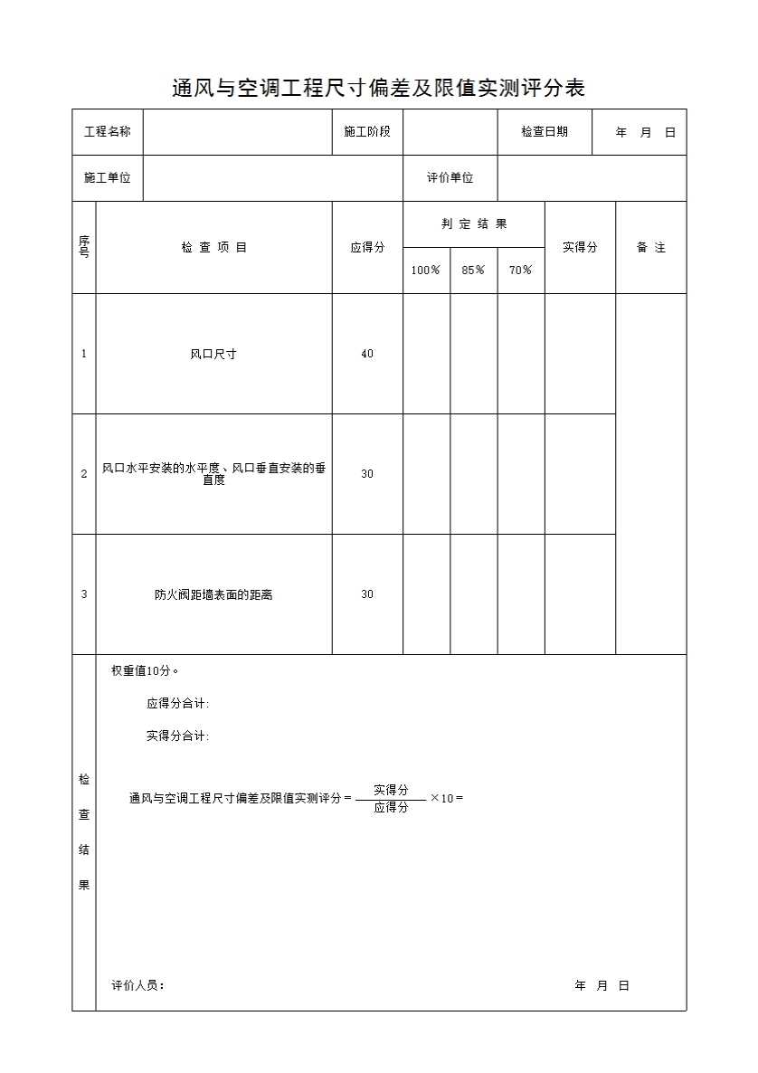 表格名称:通风与空调工程尺寸偏差及限值实测评分表