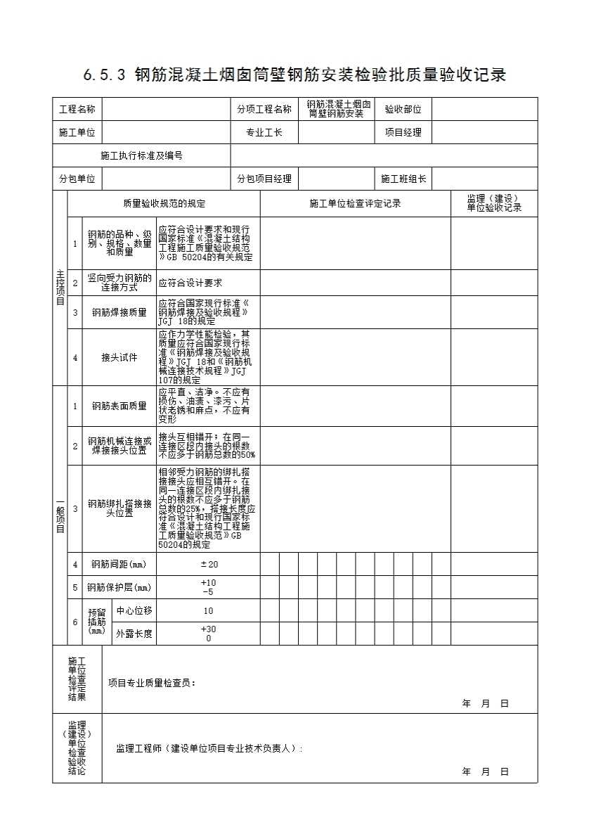 表格名称:6.5.3 钢筋混凝土烟囱筒壁钢筋安装检验批质量验收记录