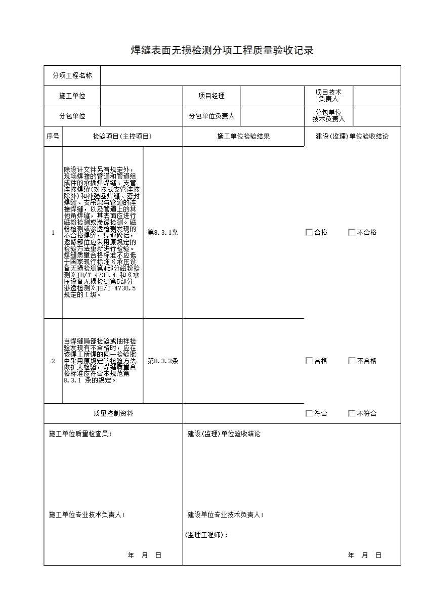 8.3.1 除设计文件另有规定外, 现场焊接的管道和管道组成件的承插焊焊缝、 支管连接焊缝(对接式支管连接除外) 和补强圈焊缝、 密封焊缝、 支吊架与管道的连接焊缝, 以及管道上的其他角焊缝, 其表面应进行磁粉检测或渗透检测。 磁粉检测或渗透检测发现的不合格焊缝, 经返修后, 返修部位应采用原规定的检验方法重新进行检验。 焊缝质量合格标准不应低于国家现行标准《承压设备无损检测第 4 部分 磁粉检测》 JB/T 4730. 4 和《承压设备无损检测 第 5 部分 渗透检测》JB/T 4730. 5 规定的Ⅰ 级。