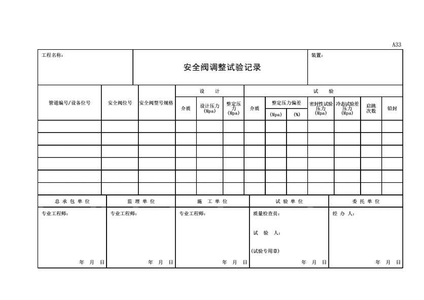 表格名称:A33 安全阀调整试验记录