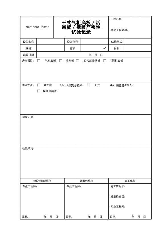 表格名称:SH/T 3503-J337-1 干式气柜底板/活塞板/壁板严密性试验记录