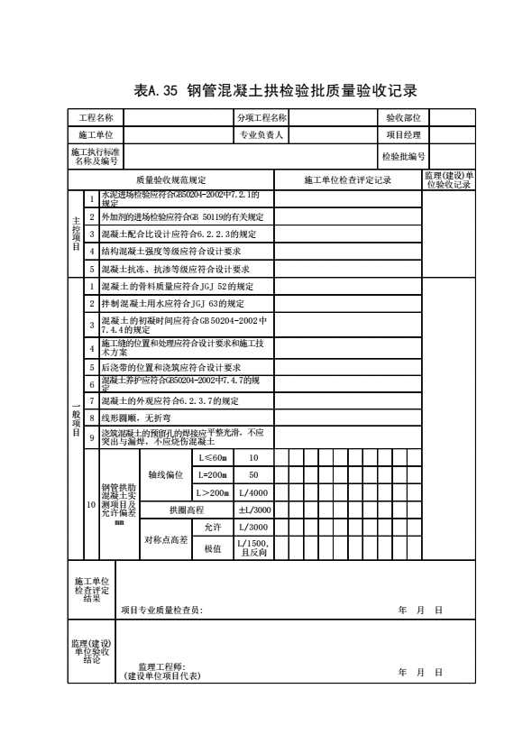 表格名称:表A.35 钢管混凝土拱检验批质量验收记录