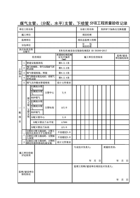 表格名称:煤气主管、(分配、水平)支管、下喷管分项工程质量验收记录