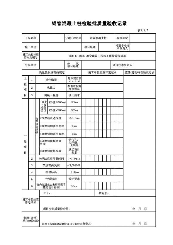 表格名称:表3.3.7 钢管混凝土桩检验批质量验收记录
