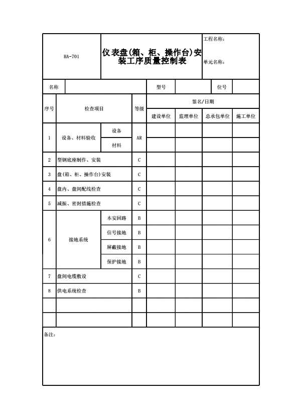 表格名称:HA-701 仪表盘(箱、柜、操作台)安装工序质量控制表