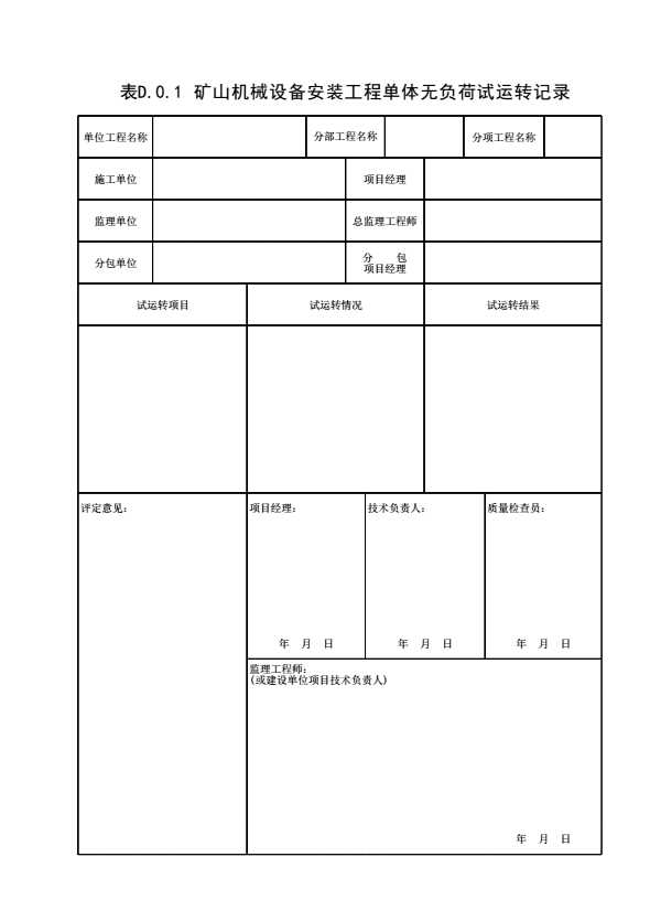 表D.0.1 矿山机械设备安装工程单体无负荷试运转记录