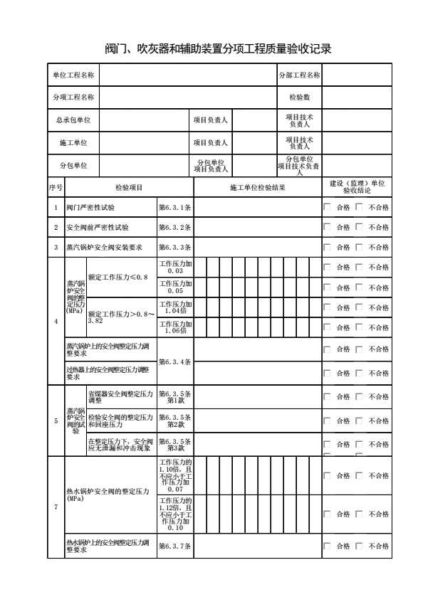 表格名称:阀门、吹灰器和辅助装置分项工程质量验收记录