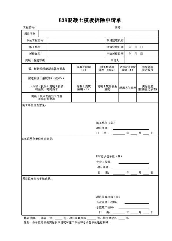 表格名称:B38混凝土模板拆除申请单