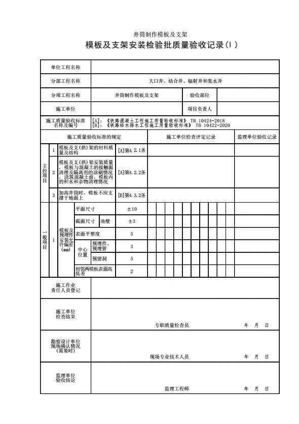 【井筒制作模板及支架】模板及支架安装检验批质量验收记录(Ⅰ)