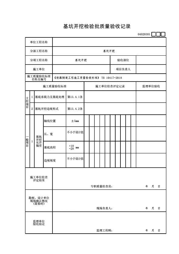 表格名称:04020301 基坑开挖检验批质量验收记录