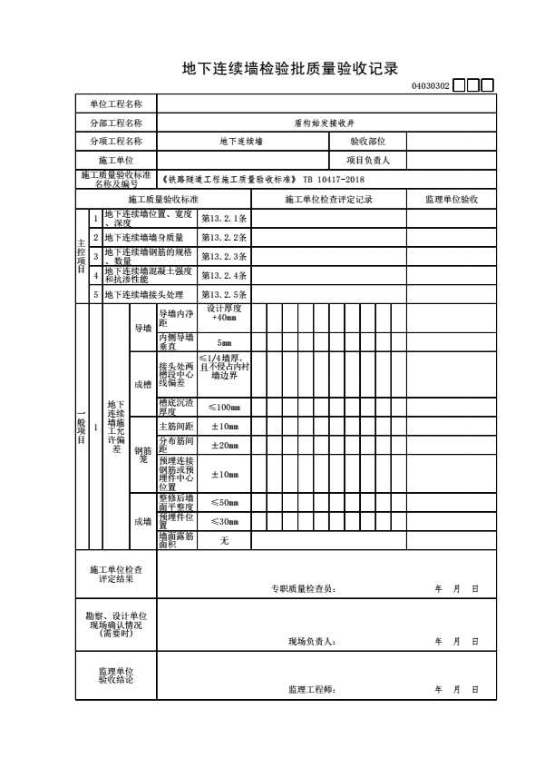 表格名称:04030302 地下连续墙检验批质量验收记录