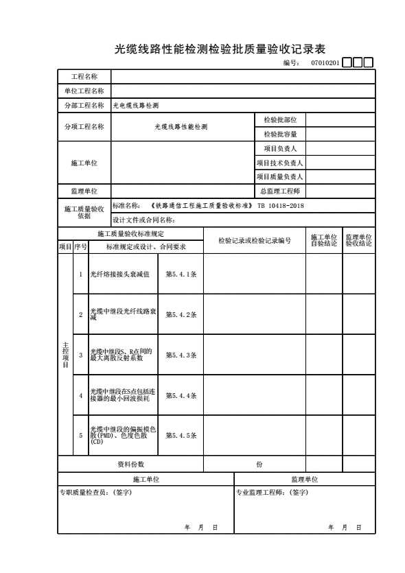 表格名称:07010201 光缆线路性能检测检验批质量验收记录表