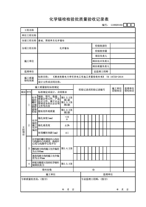 表格名称:G10020102 化学锚栓检验批质量验收记录表