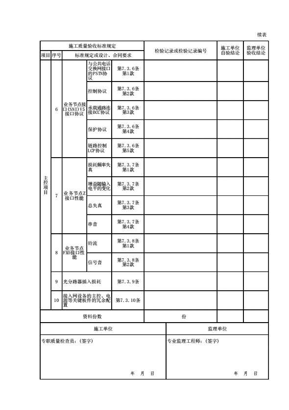 G07030201 接入网设备单机功能性能检验批质量验收记录表