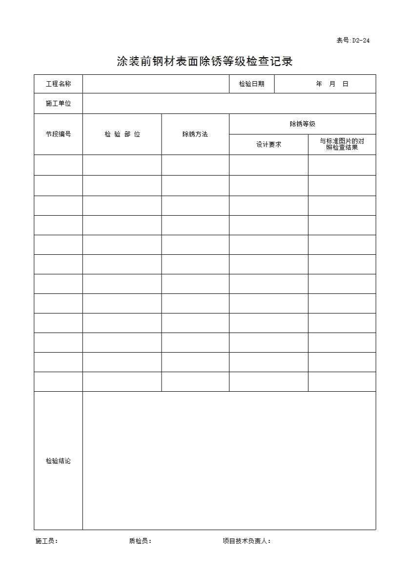 表格名称:D2-24 涂装前钢材表面除锈等级检查记录